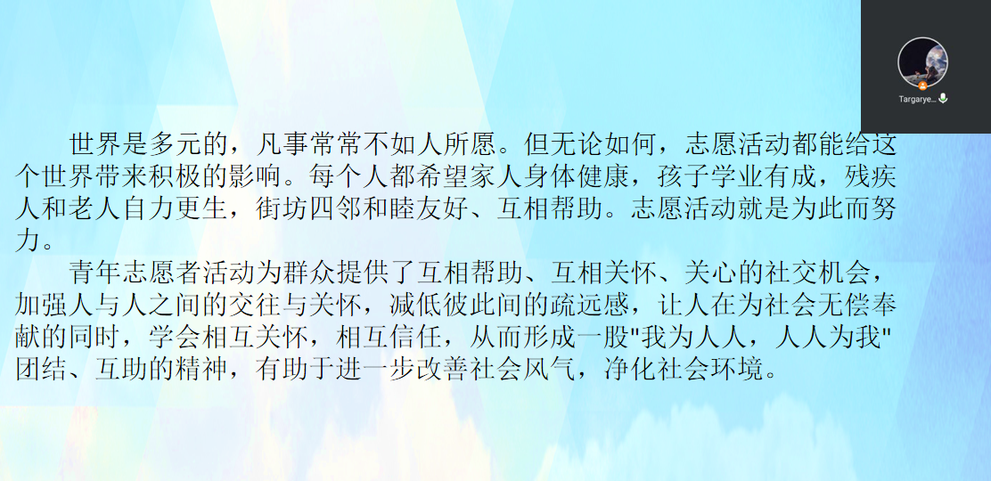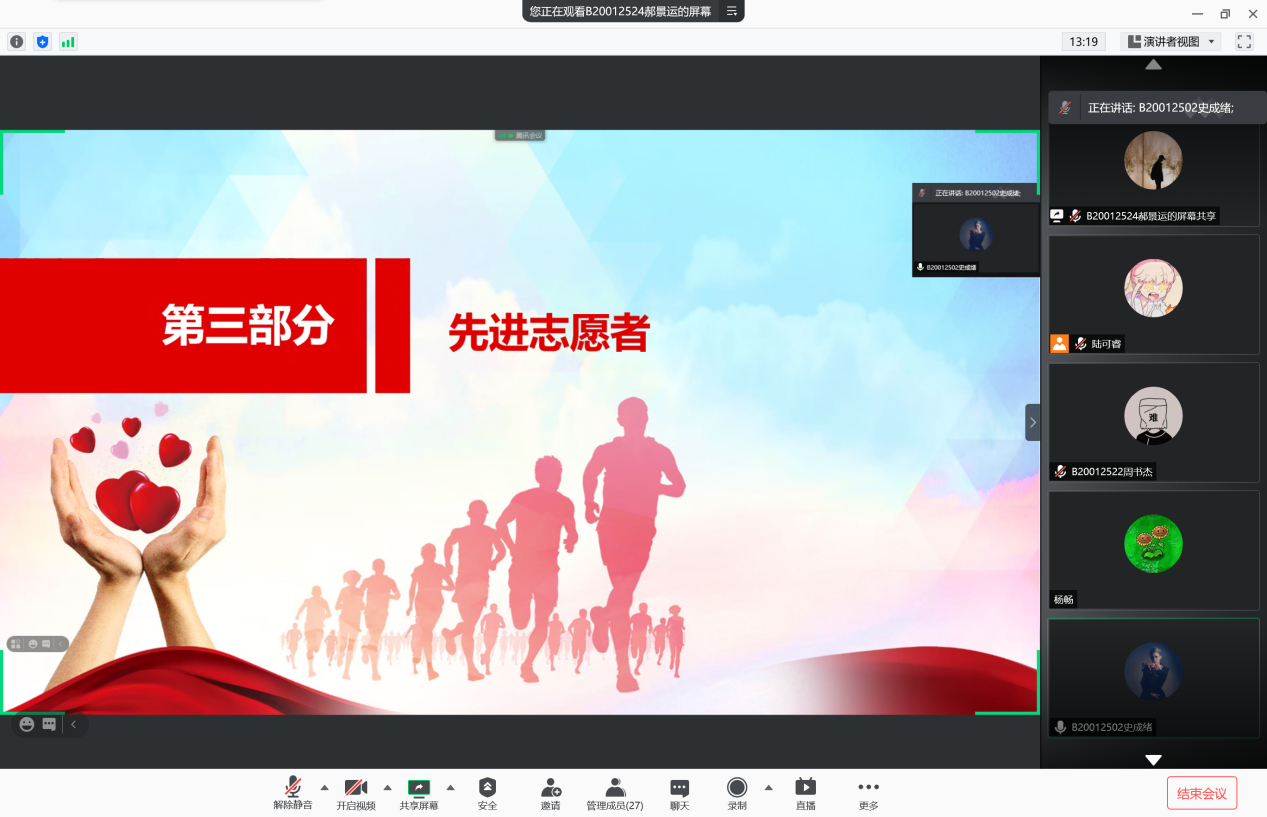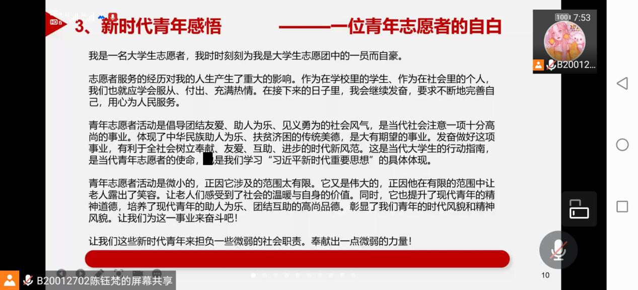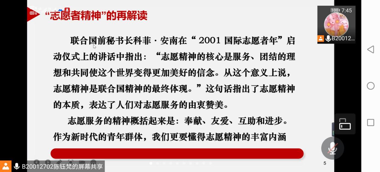电子信息工程B200127班团支书陈钰梵在活动之初引用联合国前秘书长科菲·安南的讲话进行志愿者精神的解读,从更高的层面解释了志愿者精神。班长任禹辰通过雷锋同志的事迹,带领同学们重温这教育和激励人民前进的宝贵精神财富,阐明了志愿服务精神的实质。活动中还播放了一段当代志愿者疫情期间在武汉工作的视频,通过最真实的事件向我们展现了志愿者辛苦与快乐并存的心境。活动最后通过解读一位青年志愿者的自白号召大家加入青年愿者的行列。