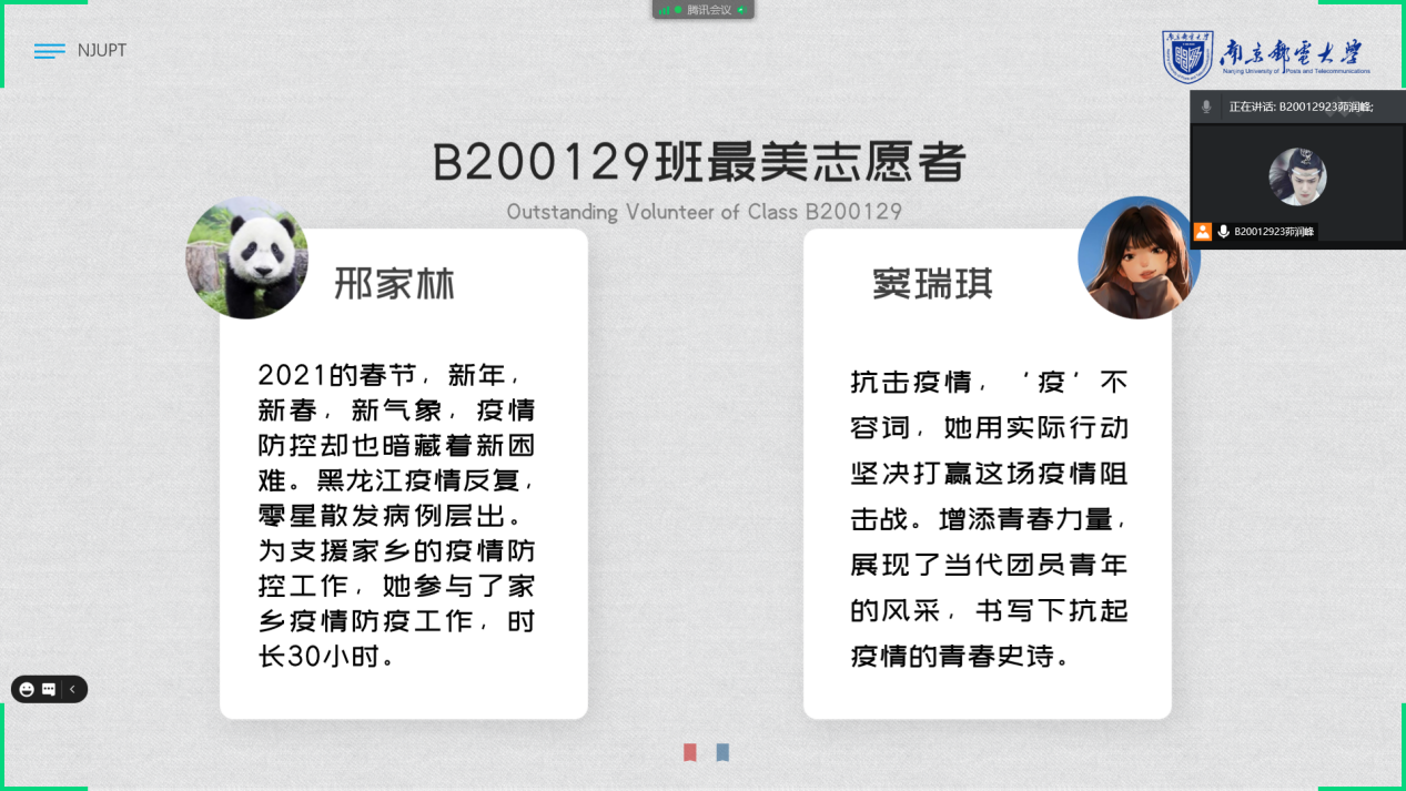 广播电视工程B200130班班长王少杰和团支书肖苏恒分别肯定了同学们在寒假期间对团中央发出号召和学校志愿服务月系列活动的积极响应,使支部获得了南京邮电大学新冠肺炎疫情防控先进集体的荣誉称号。王少杰仔细介绍了部分同学参加家乡防疫防控志愿服务的历程,并分享了部分同学的心得体会。展示的一张张照片,一个个身影,无不体现着支部成员积极向上的精神风貌。
