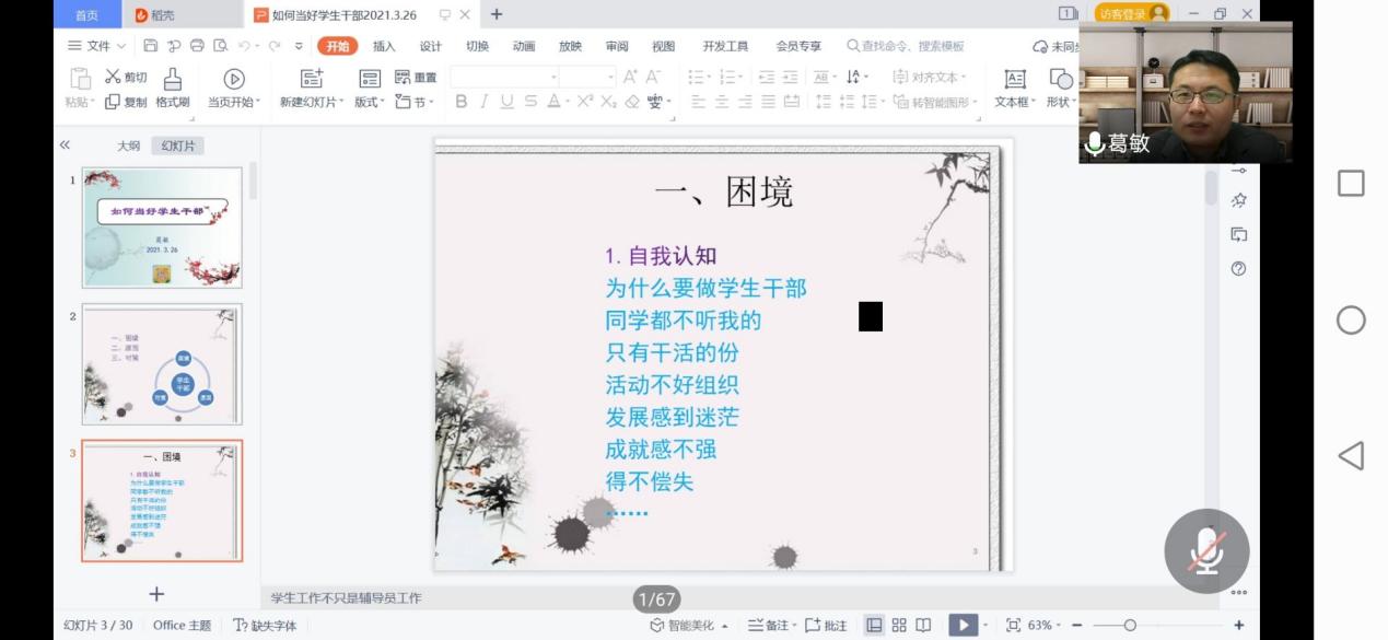 首先,就当前学生干部存在的普遍困境,葛书记从“自我认知”、“自我评价”、“外界评价”三个方面进行阐述。他指出,学生干部任职期间往往会陷入“活动难以组织”、“与同学难以沟通”、“吃力不讨好”等局面。究其原因,正是由于社会主义矛盾变化、教育领域变化、大学生思想的时代特征以及学生骨干自身原因。其中,葛书记着重分析了当代大学生思想的时代特征,他指出,当代大学生的错误思想具有十二种表现,如:大学生“精致的利己主义者现象”、“机械量化”引发大学生对“规则漏洞”的寻求意识增长、大学生由受教育者向消费者的意识转化、高等教育全面发展要求与基础教育单一培养方式形成的对冲等,这些思想使得学生干部面临种种困境。此外,学生骨干自身原因也是造成上述困境的重要原因。葛敏书记认为,个人成长经历的不同使得部分学生干部缺乏对其他同学的共情心,从而造成沟通、信任方面的难题。