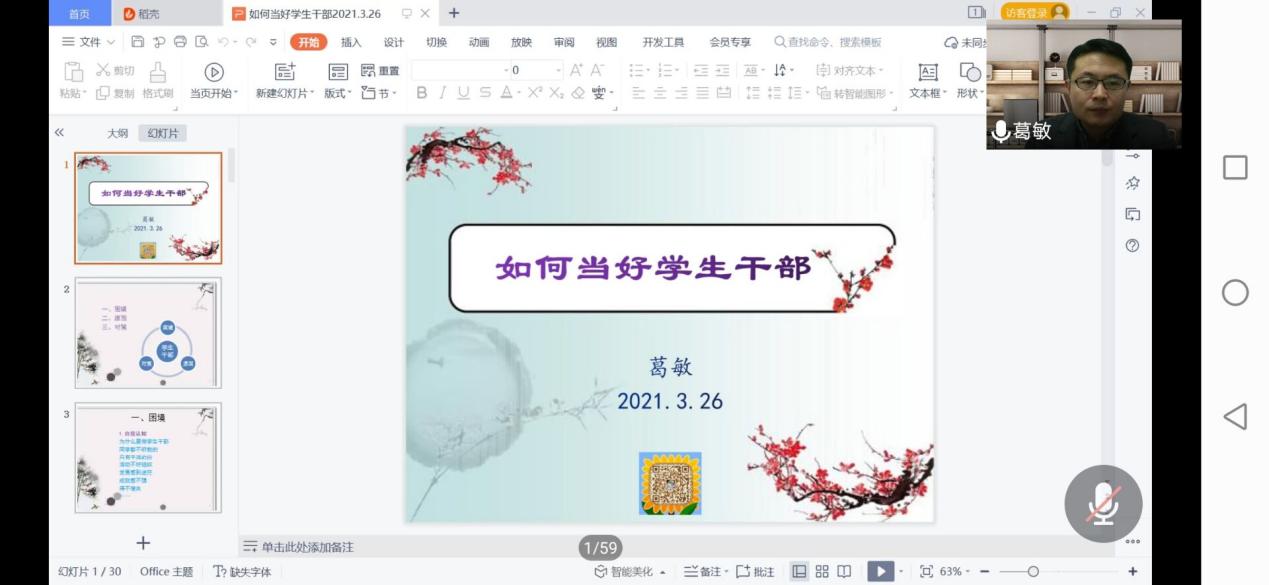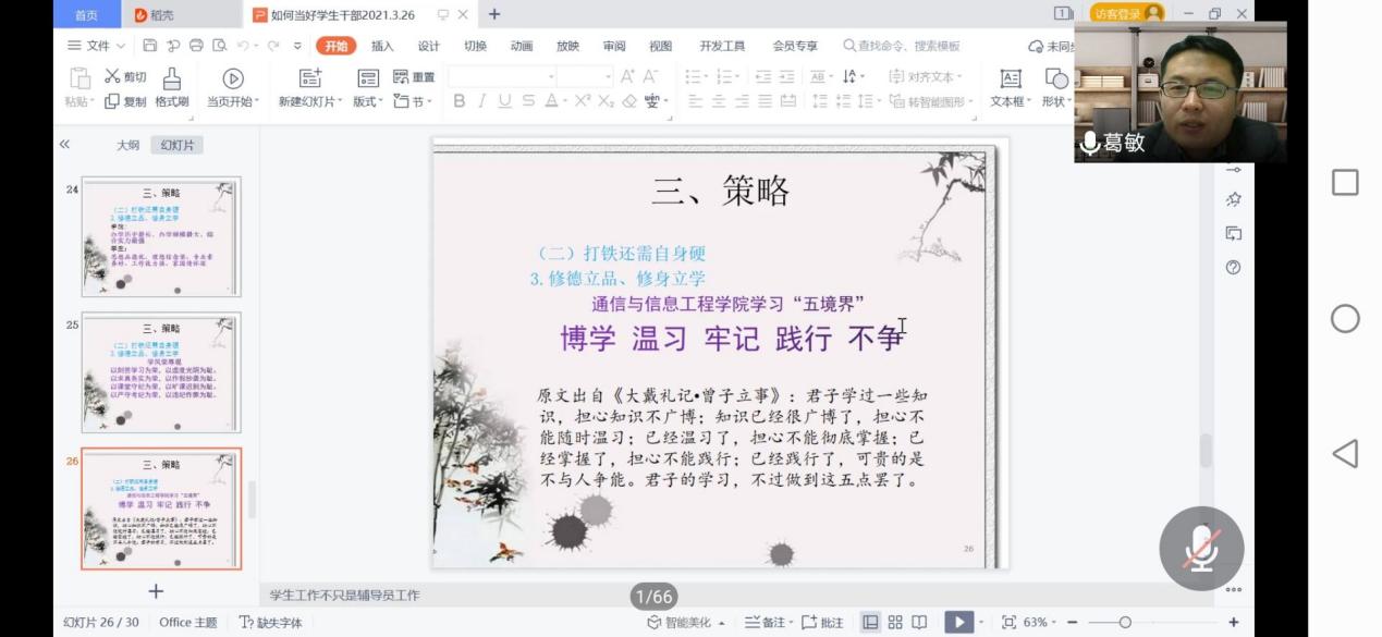 3月26日18:30,由通信与信息工程学院承办的大学生菁英人才学校第89、90、91、92期开班仪式暨开班第一课以腾讯会议的形式举行。本次开班讲座邀请到通院党委副书记葛敏进行授课,课程主题为“如何当好学生干部”。通院大学生菁英人才学校第89、90、91、92期培训班全体学员参加了讲座。本次讲座由通院2019级辅导员丁杨老师主持。