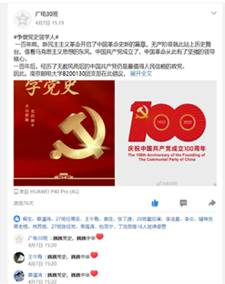 开展线下活动的同时,支部还策划开展了相关线上主题活动。利用班级官方QQ账号发表“知党情 勇亮剑”——共话时代新思想的相关文章,同学们积极响应并能够自觉完成话题接力和评论。讴歌英雄模范人物,积累实现中华民族伟大复兴的精神力量。此前,班级也是紧跟时事,多次发布相关百年党史,鼓励和引领全体同学学习党史。