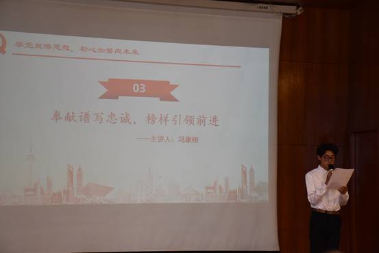 奉献谱写忠诚 榜样引领前进。在那段可歌可泣的岁月中,无数革命先烈抛头颅洒热血,在为人民谋幸福,为民族谋复兴的路上,前赴后继,留下了众多感人肺腑的故事。接下来,冯康栩同学为大家朗诵文章《凌云英雄志,拳拳爱国心》,他向大家娓娓讲述自己参观和调研故乡红色教育基地的经过和收获,让大家感受到革命先辈顽强拼搏的精神,并激励同学们在今后的学习和生活中以革命先辈为榜样,坚定理想信念、汲取红色力量、厚植红色基因。