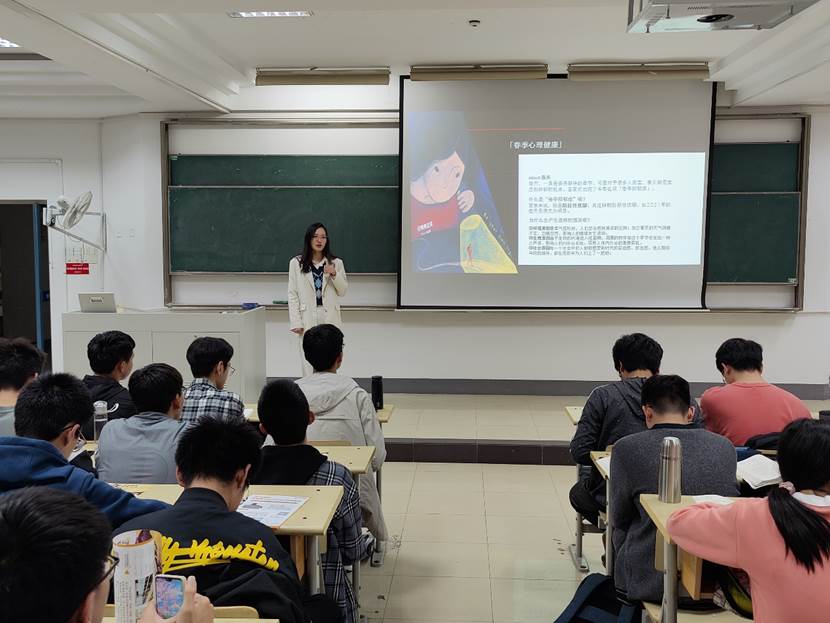 首先,辅导员姜洁阐述了心理健康对于大学生的重要性,在高中时同学们主要关注于学业,对心理认识和个人规划不足,而步入大学后,可以通过多方面的学习实践,实现自我探索,逐步成长蜕变。并介绍了春季心理健康问题,比如由环境原因、生理原因、社会原因等带来的春季阶段性忧郁。