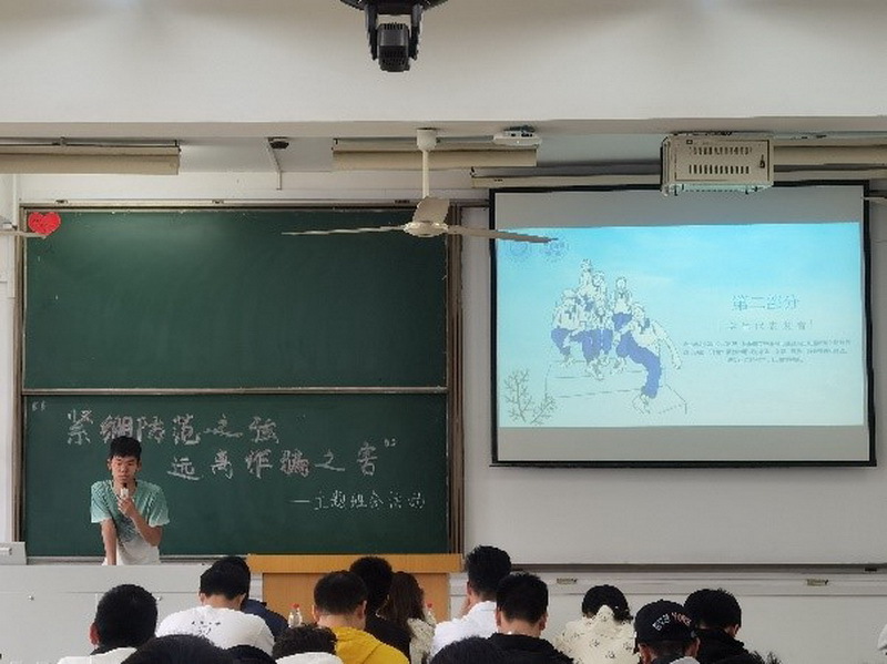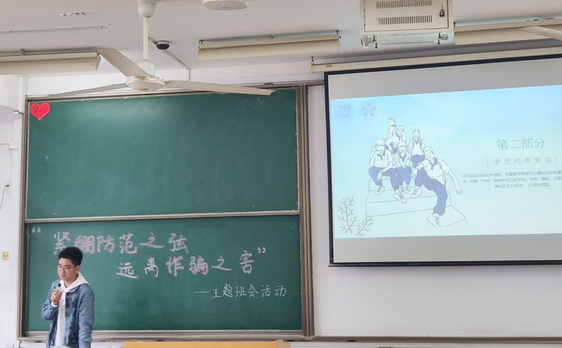 首先,23班团支书侯棒棒同学向大家讲述了当前大学校园诈骗案件频发的严峻形势。通过他的简要介绍,同学们了解到了校园诈骗离自己并不遥远,每个人的防范意识都有待提升。