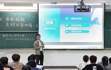 辅导员闻友龙老师通过年级大会从“网络行为安全”、“网络交易安全”和“网络交友安全”对同学们进行文明上网教育,并且指出我们要树立法律意识,坚持依法上网;树立文明意识,坚持文明上网;树立安全意识,坚持安全上网和树立自律意识,坚持理性上网。