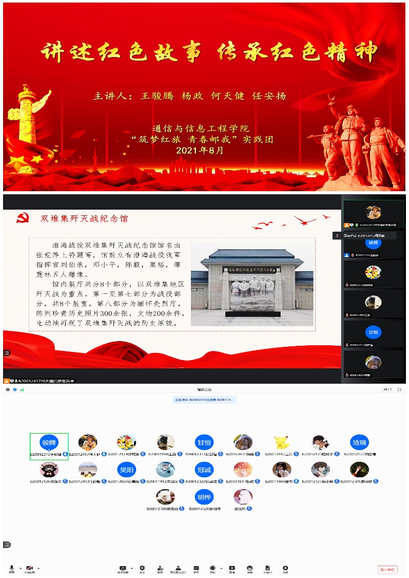 为促进学生深入了解淮海战役、回顾中国共产党筚路蓝缕奠基立业的历史,感悟百年大党坚定不移的初心使命。通信与信息工程学院“筑梦红旅青春邮我”红色专项社会实践团此次以安徽淮北市濉溪县双堆集和河南商丘市永城市陈官庄为主要调研地,带领同学们详细了解淮海战役第二阶段:双堆集歼灭战和第三阶段:陈官庄战斗,讲述淮海战役中的感人故事,传承革命先辈遗志,体悟淮海战役的精神。受疫情影响,本次调研活动通过线上“云实践”的方式开展,何天健、任安扬、王骏腾和杨政四位同学分别以“缅怀革命先烈 传承红色精神”和“忆峥嵘岁月传红色血脉”为主题,讲述红色故事,传承红色精神。本次“云实践”由指导老师闻友龙主持,实践团全体成员参与。