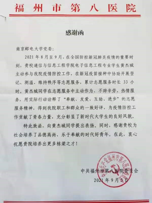 近日,中共福州市第八医院委员会向学院发来感谢信,感谢我院学子黄杰城在疫情防控中所作的努力,感谢我院为社会培养了品德高尚、乐于奉献的时代好青年,并衷心祝愿我院培养出更多栋梁之才。
