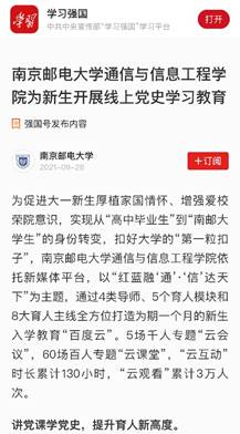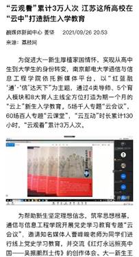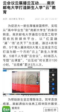 “云上”入学教育紧跟时代、贴合实际,成果丰硕、成效显著,社会反响热烈,深受家长好评。活动受到人民网·党史学习教育官网、学习强国全国平台、学习强国“南京邮电大学”强国号、中国新闻网、中国江苏网、交汇点、江苏党史学习教育、新华日报、扬子晚报、南京日报荔枝网等多家媒体广泛关注,新生家长好评如潮。
