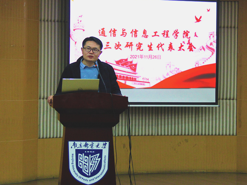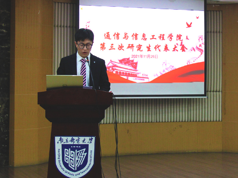 会上,院党委副书记葛敏致辞,他代表学院党委向通信与信息工程学院第三次研究生代表大会的顺利召开表示热烈祝贺!他指出,近年来通过全体师生的共同努力,学院取得了许多可喜的成绩。特别是通院学子在科创赛场和就业市场上显示出的强大竞争力和广泛的社会认可度,都表明通院毕业生为祖国通信事业的快速发展做出了巨大的贡献,也为南邮成为业内公认的国家通信人才的优质基地立下了汗马功劳。他指出,通院有着辉煌的过去,如何创造光明的未来,这就需要全体通院人居安思危,打铁必须自身硬。特别是研究生同学,要锤炼大胸怀、涵养大格局、作出大贡献。对此,他提出研究生同学要坚守家国情怀,争当“强国有我”的急先锋;要心存学院情愫,让“科以人重科益重”不断上演;要保有个人情操,努力让自己成长为一个和谐幸福的人。