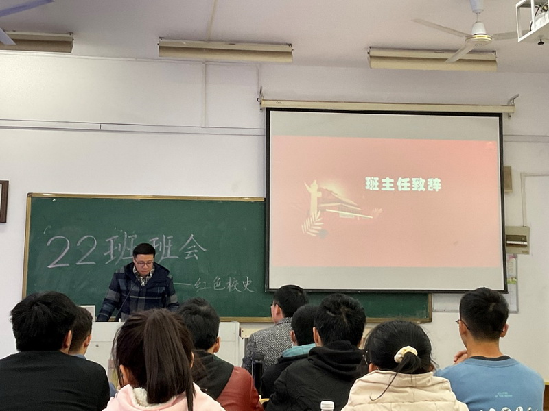 11月6日至20日,我院B210122-27班“习红色校史燃赤子之心”学习红色校史主题班会活动分别于教3-104、105、205举行。B210122班班主任刘子威老师、B210124-25班班主任洪涛老师、2021级辅导员汪文博老师及全体同学参加了班会。班会由各班班长主持。