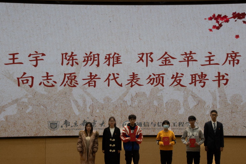 王宇、陈朔雅、邓金苹向志愿者代表颁发聘书