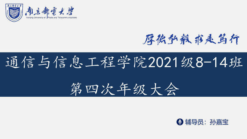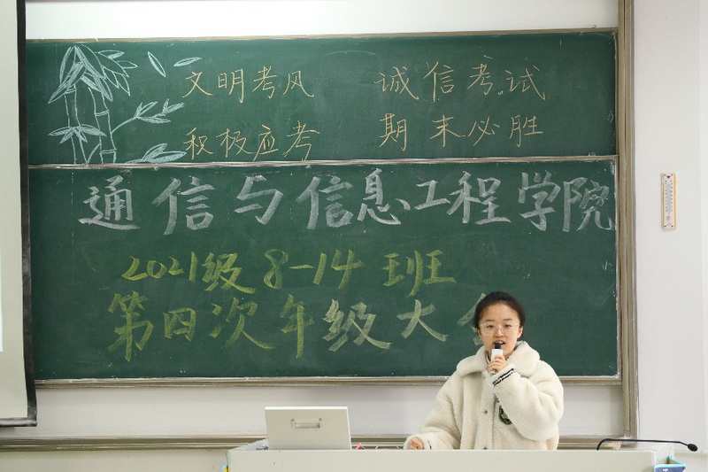 期末考试将至,为了让同学们能够安心复习、宽心备考、定心考试、放心归家,以积极向上的心态应对本学期末的学习生活。我院2021级通信工程专业B210108-B210114班于2021年12月22日在教2-102开展以“文明考风,诚信考试,积极应考,期末必胜”为主题的第四次年级大会。B210108-B210114班全体同学参与,辅导员孙嘉宝老师主持本次会议。