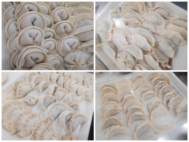英语课程结束后,同学们匆忙赶到南三食堂准备大展身手,在班委们的组织和食堂阿姨的帮助下,包饺子所需的馅料和饺子皮已经提前准备好。在辅导员蒋友林老师宣布活动开始后,同学们迅速忙碌了起来。不一会儿,各种各样的饺子出现在桌面上,“元宝”形状、六褶对称的、麦穗状以及富有创意的小笼包和飞碟大饼等,每一位同学都在用自己的双手创造出属于自己的艺术品,食堂充满了欢快的气息,同学们脸上洋溢着灿烂的笑容。