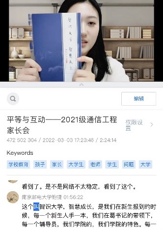 家校携手,培育“硕果”。通过线上问答解惑环节,辅导员鲍捷老师了解到当前家长朋友们主要通过微信与大学生进行日常沟通与联系。鲍老师就“数字鸿沟中文化反哺与再哺育”引入话题,共同商讨基于微信平台互动传播机制中,子代与亲代交流的特点,建议大学生家长要与子女建立平等、尊重、互信、互爱的良好交流方式,在倾听中理解,在鼓励中共进,共画家校共育同心圆,助力通工邮子书新篇。