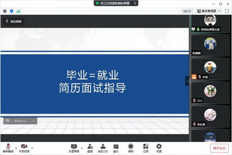 陈韩总监针对疫情形势下人才市场的当下需求进行研析,引导同学们树立“先就业、再择业、早就业”的正确就业观念,及时调整就业目标和心态,脚踏实地、不务空名,以自身能力为着眼点,增强就业技能,提升专业素养。他主要围绕简历制作、面试技巧两个方面通过诸多具体案例为同学们进行细致讲解,帮助参会同学通过调整简历,更好地匹配岗位需求,凸显自身优势。此外,陈总监就同学们关于面试问题逐一做出解答,以用人单位的角度帮助学生深入了解面试,提升面试技能。