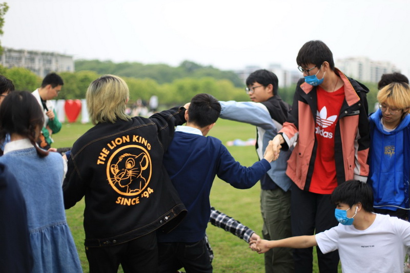 在蒋友林老师的主持下,同学们进行了“心有千千结”的游戏,同学们按学号分组围成两个圆圈,记住自己左右的人,然后随机走动,彻底打乱后再按照之前的左右顺序把手拉在一起,大家交错地连接在一起,正似游戏的名称“千千结”。随后同学们在不松手的前提下,通过翻、跨、钻等方式把“结”解开,恢复为最初的两个圈。在这一过程中,同学们充分发挥自己的聪明才智,积极参与其中,蒋友林老师趁机鼓励大家通过游戏思考人生,尝试走出自己的舒适圈,突破自我。