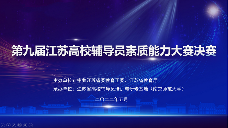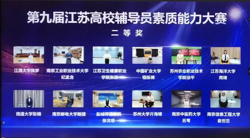 5月3日至4日,由中共江苏省委教育工委、江苏省教育厅主办的第九届江苏高校辅导员素质能力大赛决赛在江苏省高校辅导员培训与研修基地(南京师范大学)举办。根据疫情防控需要,大赛采用线上方式进行。我院鲍捷老师与来自全省各高校共40名优秀辅导员同台竞技,荣获二等奖。