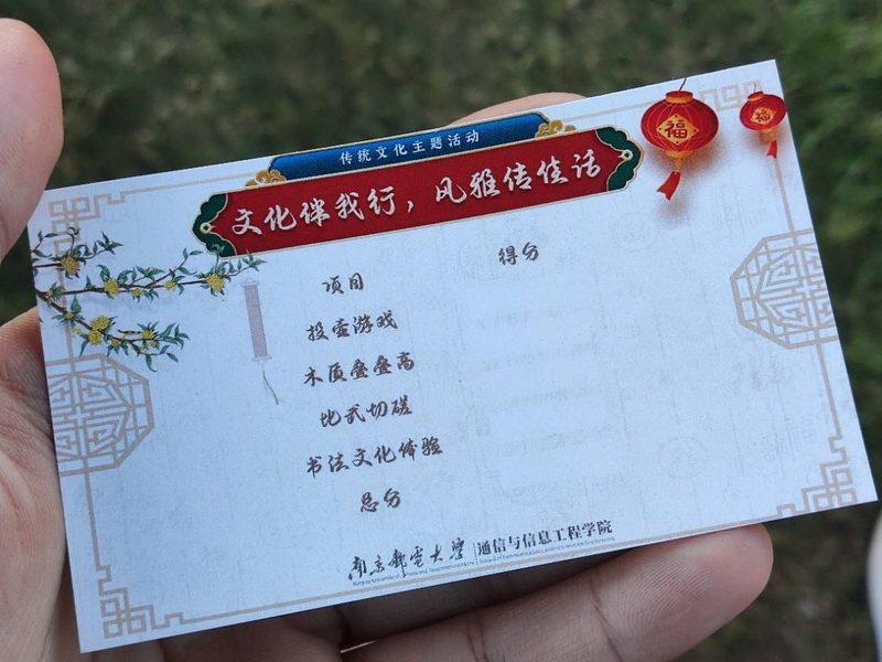 近几年,彰显中华传统文化的活动、作品在青年一代心中的认同感越来越高,“国潮”风在全国上下火出新高度。值此端午到来之际,通信与信息工程学院学生会举办“文化伴我行·风雅传佳话”趣味传统文化活动,意在将大学生思想政治教育与中华优秀传统文化相结合,引导广大学生不断发现中华文化之美,将文化强国、文化自信根植于心。本次趣味传统文化活动充满青春活力和时代精神,形式活泼,丰富多彩,包含投壶、叠叠高、趣味书法等项目,在丰富课余生活的同时,加深了同学们对传统文化的认识和了解,让同学们对博大精深的民族文化有了强烈的共鸣。
