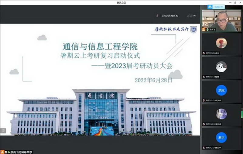 为关心我院2019级同学考研备考情况,在暑期开展云上考研复习活动,调动同学们备考积极性,增强考研信心。6月28日下午,通信与信息工程学院于腾讯会议召开暑期云上考研复习启动仪式暨2023届考研动员大会。研究生院招生办公室主任王霁、院党委副书记、副院长王晶,副院长田峰、副院长赵海涛、院分团委书记、2019级辅导员丁杨老师、2019级辅导员蔡高飞、王琛、赵厚、齐小凤老师出席了本次活动,2019级全体考研学生参加了本次会议。会议由院党委副书记王晶主持。
