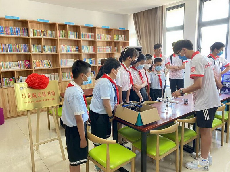 实践团联合社会力量,为都会小学筹集资金购置了一批航天科普图书与空间站、航天器模型,在学校图书馆搭建起自己的“星光航天读书角”。