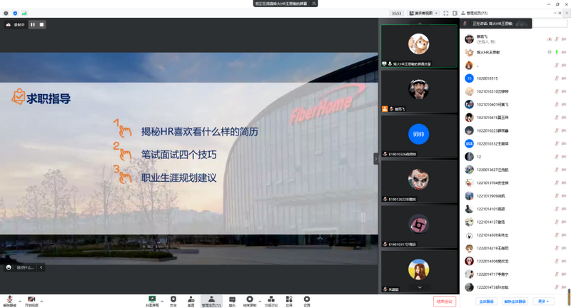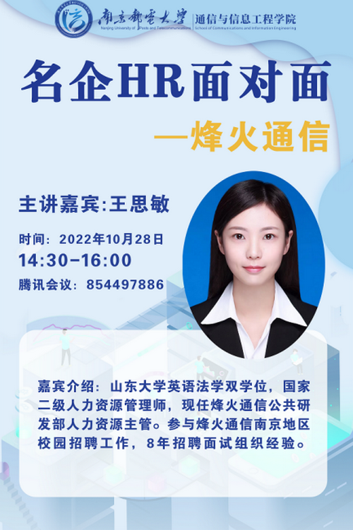 为了引导2023届毕业生树立正确就业观,以积极的态度面对当前激烈的就业竞争,促进未就业的同学找到心仪的工作。10月28日下午,通信与信息工程学院开展名企HR面对面就业指导专题讲座,邀请烽火通信公共研发部人力资源主管王思敏担纲主讲人,我院2023届本科、硕士毕业生积极参与,全体毕业班辅导员出席会议,会议由辅导员蔡高飞主持。