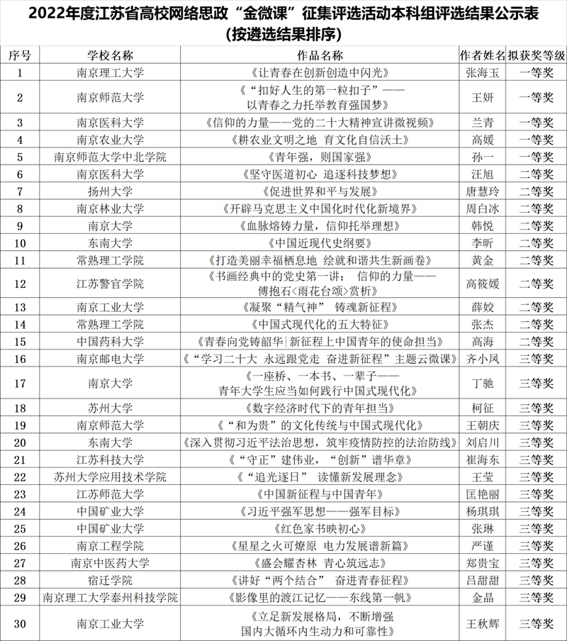 2023年1月4日,江苏省高校网络思想政治工作中心发布了2022年度江苏省高校网络思政“金微课”征集评选结果,我院齐小凤老师的作品在本次活动中荣获三等奖!