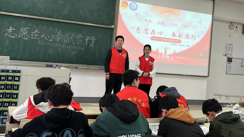 B220110团支部开展了以“志愿服务精神渗入校园”为主题的团日活动,带领同学们了解志愿者的先进事迹,包括奉献青春投身西部的姜展彬、冬奥会参与志愿服务的袁玮婷、奋斗在基层专注服务人民的李乐。随后,班长李子涵分享了丰富的志愿服务经验,展现了蓬勃向上、无私奉献的青春风貌。最后,团支书郝成荐号召大家积极参加志愿服务活动,一同塑造更加美好的校园和社会。