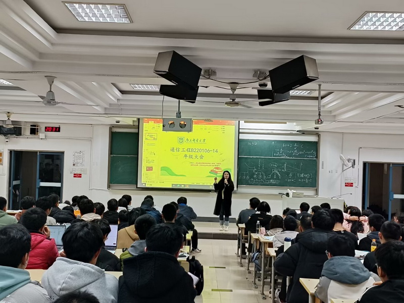 其次,年级大会以学生实际需求出发,围绕总结过往、分析现状、展望未来三个方面开展。辅导员王文琪针对同学们上学期期末绩点、不及格情况等进行了详细的数据对比分析,指出了当前学风学情的不足,要求同学们务必自律自省,同时强调了诚信考试的重要性,进一步规范学习方式、端正学习态度,明确学习目标,加强诚信教育,促进学风考风进一步好转。围绕学生提出的成长困惑及关心的问题提供有针对性的引导,对保研、考研就业情况等进行了解读与规划,鼓励同学们积极参与学生活动、参加学科竞赛等促进个人综合素质的提升,助力同学们确立更加清晰的学业规划。充分发挥“瑞华杯”南京邮电大学第六届大学生年度人物的典型示范作用,勉励同学们要学习身边榜样,汲取奋进力量,以经历磨练迎来云程发轫。