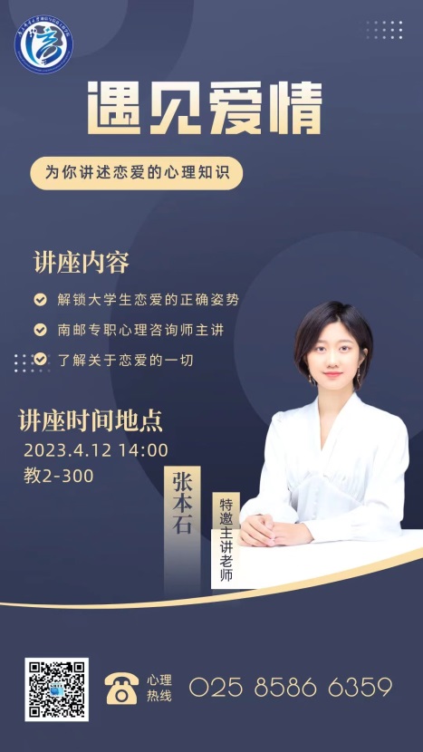 爱情是什么?或许很多同学产生过这个疑问。为了帮助同学们正确认识爱情、学会处理恋爱关系中的问题,通信与信息工程学院心理健康工作站于2023年4月12日在教二300举办“遇见爱情”恋爱心理知识主题讲座。本次讲座有幸邀请到南京邮电大学专职心理咨询师张本石老师作为主讲老师,为大家介绍关于爱情的一切。