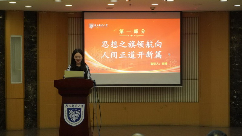 徐晴同学宣讲的主题是:思想之旗领航向,人间正道开新篇。她呼吁我们广大青年要坚持用习近平新时代中国特色社会主义思想武装头脑,为全面建设社会主义现代化国家贡献青春力量。