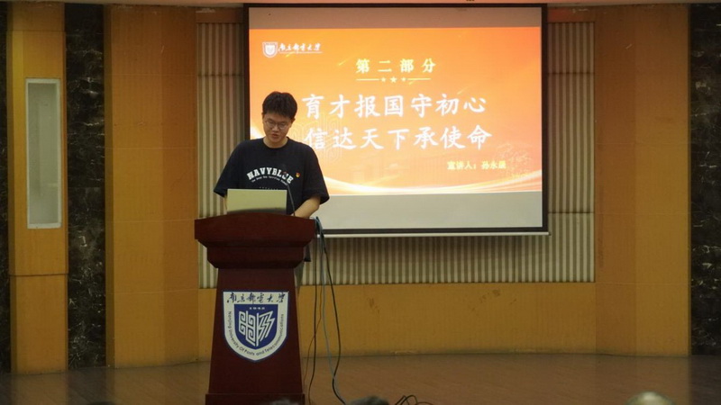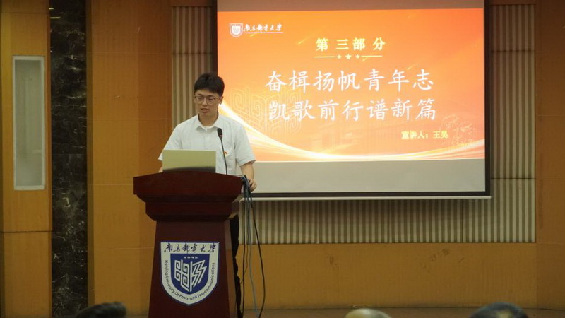 王昊同学宣讲的主题是:奋楫扬帆青年志,踔厉奋发创新篇。他回顾了南邮学子近年来取得的佳绩,呼吁同学响应赵厚麟学长的号召为学校争光,为国家科技自立自强作出南邮贡献,发出南邮声音。