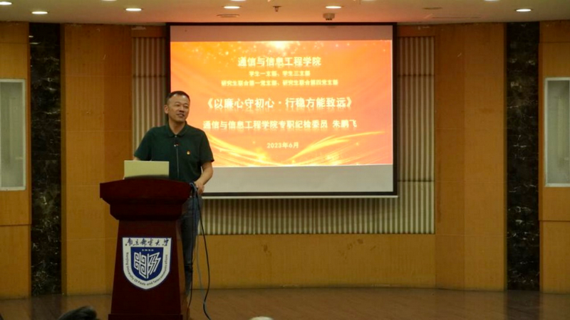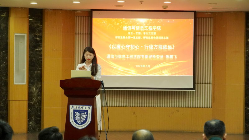 通信与信息工程学院党委委员、专职纪检委员朱鹏飞以《以廉心守初心,行稳方能致远》为题讲授廉政教育专题党课。朱鹏飞委员紧紧围绕“六大纪律”主线,结合实际案例对其中常发、易发问题进行解读与剖析。着重强调遵守廉洁纪律是每个党员应尽的责任,也是我们推进党风廉政建设、预防和惩治腐败的重要保证。最后,他希望即将走出校园,进入社会的毕业生们可以时刻坚守初心,走好每一步路。