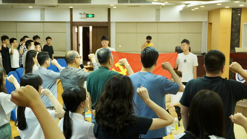 在鲜红的党旗下,全体党员佩戴党徽,举起右手,紧握拳头,由学院党委副书记、副院长王晶领誓,全体党员郑重宣誓:“我志愿加入中国共产党,拥护党的纲领,遵守党的章程,履行党员义务,执行党的决定,严守党的纪律,保守党的秘密,对党忠诚,积极工作,为共产主义奋斗终身,随时准备为党和人民牺牲一切,永不叛党。”铿锵誓言,心潮澎湃,初心如磐,砥砺前行。