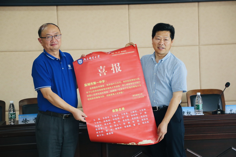 江苏省盐城中学(教育集团)党委书记、校长丁才林,副校长朱俊、李生,纪委书记孙思,盐城市实验高级中学高三年级主任蔡今春,盐城市第一中学党委书记、校长陈建权,副校长尤为军等相关领导,我校盐城招生组组长、通信与信息工程学院党委书记徐雷,我校团委书记秦昌建及相关老师参加了颁发仪式。仪式上,中学校长们分别致辞对王校长一行表示热烈欢迎,对南邮浓厚的红色底蕴、悠久的办学历史以及社会评价良好的高质量就业表示高度赞赏,对考取南邮的优秀学子表示祝贺,希望同学们在进入大学的学习生活后踔厉奋发,为母校增光添彩。