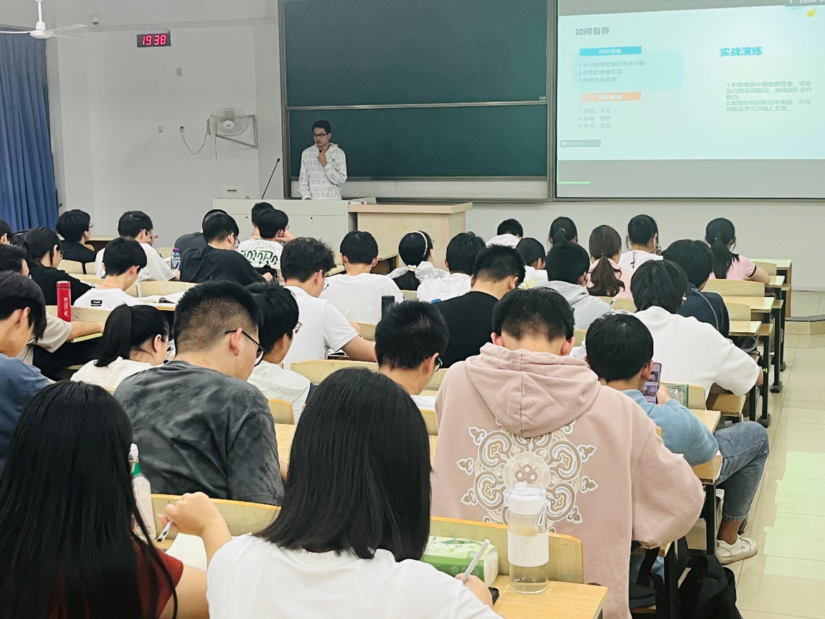 张庆轩同学介绍了数学建模的类型及奖项设置,强调了网络学习对数模备赛的重要性,队伍成员均具备数模知识和互相配合的重要性,以及推荐同学们多多参加比赛演练,查漏补缺,找出问题所在。同时,结合个人经历分享了数模经验总结。