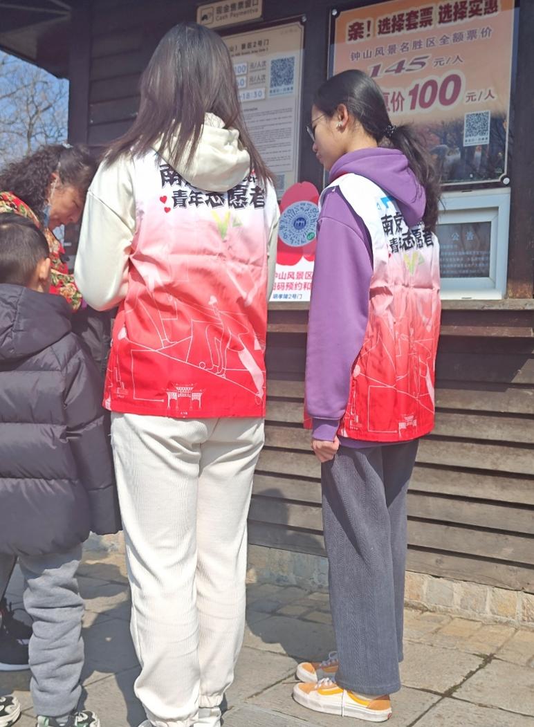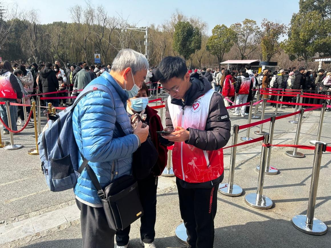 活动当天清晨,三十多名青春昂扬的通院志愿者们在苜蓿园地铁站口集合并完成签到,随后在景区负责人的指挥下,志愿者们被分成六组,分别前往明孝陵景区不同入口进行志愿工作。每一个工作点位配有景区工作人员为志愿者们讲解服务过程中的细节和注意事项,并为志愿者们分配各自的工作内容,例如引导旅客前往购票点、帮助旅客进行线上购票、维持现场秩序等。接到任务后,志愿者们立刻前往工作岗位尽职尽责地完成工作任务。活动开展期间,志愿者们为每一位咨询者答疑解惑、帮助不熟悉手机的爷爷奶奶们购票、甚至同时指导多人买票,志愿工作有条不紊地进行。