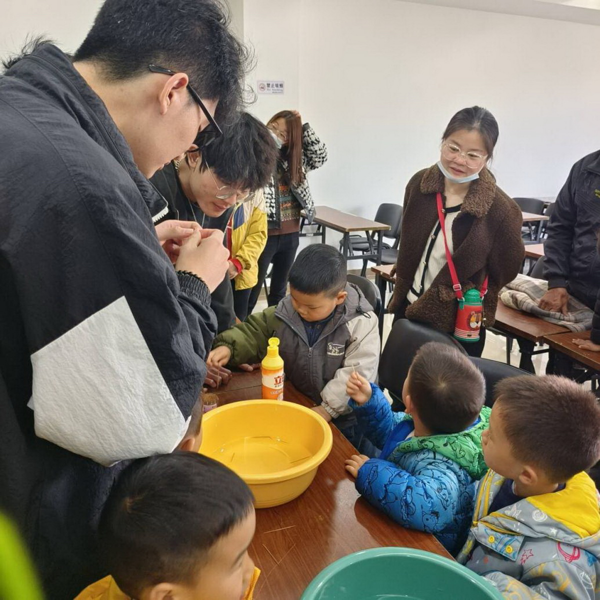 活动中,志愿者们向小朋友们展示了生活中有趣的科学小知识,激发了他们对科学的兴趣。之后又通过两个简单的趣味小实验让小朋友们亲身体验了生活中存在的科学现象,并为他们解释了其背后的原理。牙签快艇实验让小朋友们认识到水表面存在张力;撬不动的尺子实验让他们了解到大气压强的作用。这些小实验中奇妙现象和有趣的过程深深地吸引着孩子们,既培养了他们对科学的热爱与探索,也增强了他们的动手实践能力。在实验结束后,志愿者带领小朋友们利用纸和彩笔绘画出他们心中的未来世界,并一起合影留念,记录下这个美好的瞬间。