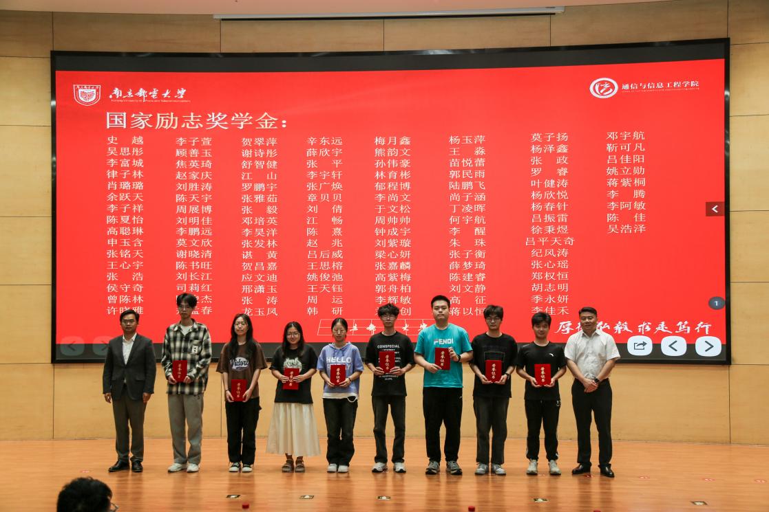 随后,我校教务处副处长臧庆、学院党委副书记、院长邹玉龙为国家奖学金、国家励志奖学金获奖代表颁奖,我校招生就业处副处长赵伟,江苏源本科技集团董事长张福德为源本科技奖学金获奖代表颁奖。“源本科技奖学金”是由江苏源本科技(集团)股份有限公司在我院设立,旨在进一步加强与高校交流互动,推动教育事业发展,激励更多学生勤奋学习,刻苦钻研、勇于创新。张福德董事长表示:“设立奖学金是企业反哺教育的责任,期待与学院共同培养‘硬核’创新人才。”